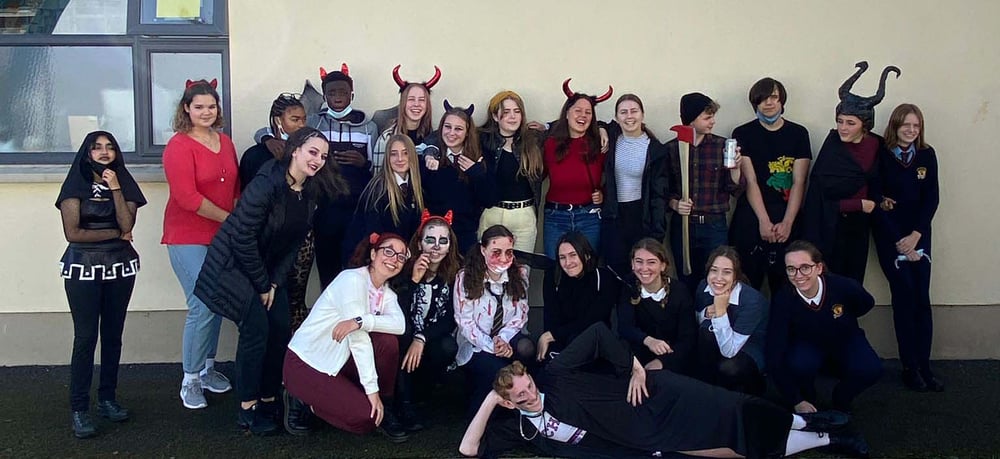 Anfang Oktober hat die Halloween Saison angefangen und wir haben angefangen unser Haus zu dekorieren (was leider, aufgrund einer sehr kratzbürstigen Katze, dieses Jahr nicht als zu groß ausgefallen ist) außerdem haben wir angefangen uns Gedanken über unser Kostüm und den 31. Oktober zu machen. In den folgenden Tagen konnte man dann auch in unserer Nachbarschaft immer mehr Blutspuren und Skelette an den Fenstern und Türen erkennen und die Supermärkte haben langsam angefangen Special Trick and Treat Angebote zu machen. Nicht nur in meiner Gastfamilie hat sich die Atmosphäre immer mehr ins gruselige verwandelt, auch in der Schule haben die Lehrer angefangen zu dekorieren und Halloween Games, wie ein Scavanger Hunt durch unser kleines Town, zu veranstalten . Am letzten Schultag bevor wir in unsere Mid-Term Break gegangen sind, hatten wir eine kleine Halloween Party mit Kostümen und Horror Movies. Meine Host Sister und ich hatten uns dazu entschieden ganz klassisch als Wednesday und Pugsley (Addams Family) zu gehen. Viele unserer Mitschüler haben aber auch einfach, die von der Schule gestellte Verkleidung, ein Teufelskostüm, genutzt. Verbunden mit den Verkleidungen gab es dann einen, von dem Transition Year, organisierten Kostüm Wettbewerb, welchen ein Junge aus meinem Jahrgang als Cheerleader verkleidet gewonnen hat. In den eigentlich Unterrichtsstunden, wie vorhin schon kurz angeschnitten, haben wir die Conjuring Reihe geschaut und „Treats“, welche unsere Lehrerin uns mitgebracht hat, gegessen.