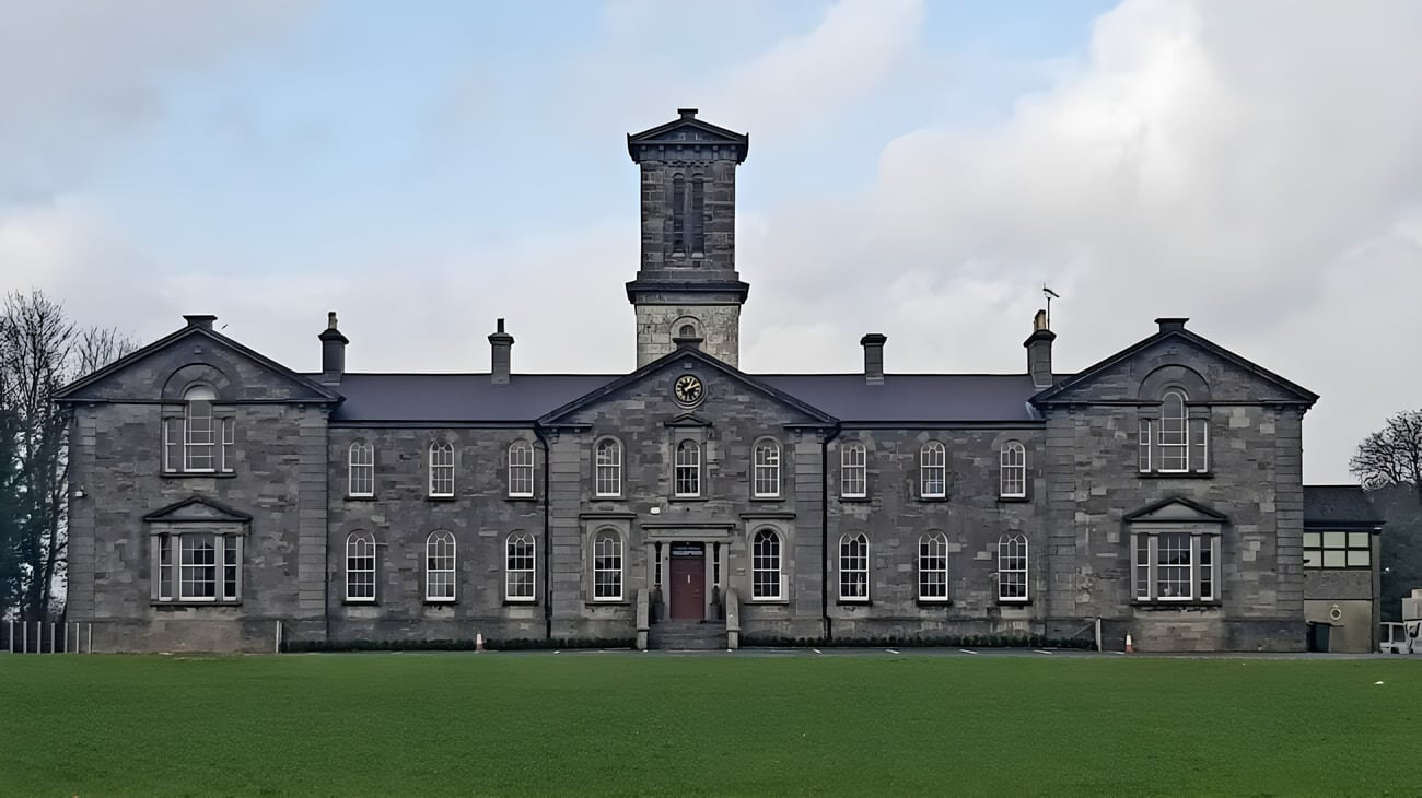 Das Gebäude mit einem hohen zentralen Turm der Coláiste Mhuire Mullingar steht auf einem grasbewachsenen Feld unter bewölktem Himmel.