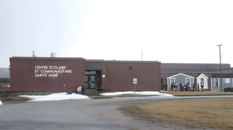 Das Gebäude der École Sainte-Anne aus braunen Ziegeln mit Schnee auf dem umliegenden Gras.